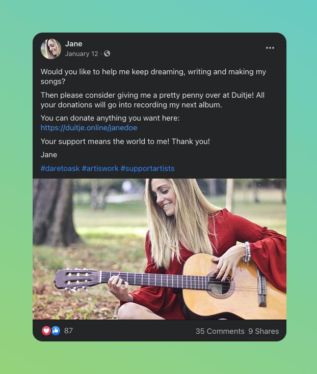Kom je een fantastische kunstenaar tegen? Deel de liefde en nodig ze uit voor Duitje! Samen steunen we de kunst.
